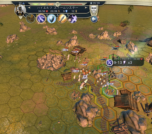 都市の防衛にユニットを残してきているので、最終的なユニットは、サンドレン・ユニコーンライダー・ストームシスター・ソードマン・ロングボウマン*2、トレビシェット・(大農場で得た)タイガー・ソードマンで攻撃。