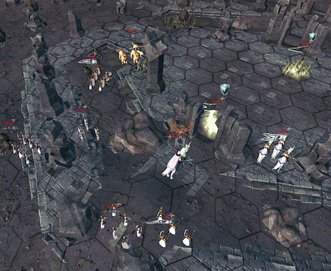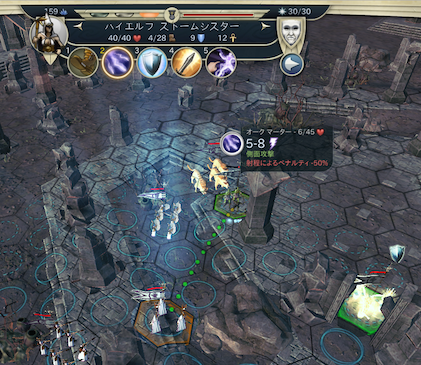 近接ユニットのソードマン(右のソードマンで障害物を攻撃)を先行させ、その後に遠距離ユニットのストームシスターを。ソードマンのような近接ユニットは1へクス空けて配置するのが基本。こうすると、敵が攻撃した時にとなりの近接が背後をとりやすい。また、後方の遠距離ユニットが隙間から射撃できる。射撃は自軍ユニットに遮られた場合でも視界ペナルティが生じる。左のソードマン・ストームシスターを1つ空けてとなりに。サンドレンはストームシスターのななめ後ろに。別働隊のソードマン・ストームシスターも狭い道を進ませる。これでターン終了。移動終了時、ユニットは移動した方向を向いている。右クリックをしてドラッグすることで、同じ位置で方向を変えられる。敵のほうを向いて終了するようにする。