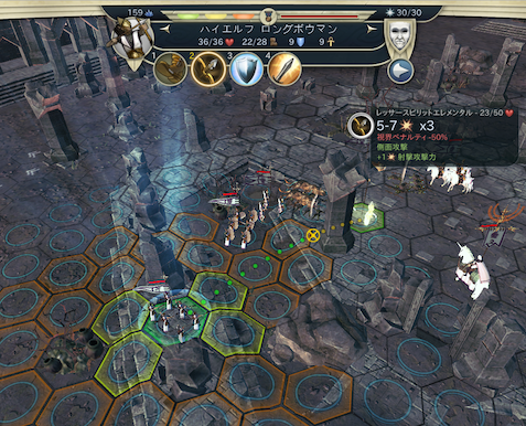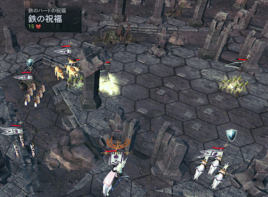 次にサンドレンが前進してエレメントに投げ鶏。古代の遺跡で別のアイテムを取得していたら酸の吹き矢で射撃。今回はここでサンドレンがレベル2に。通常なら2回射撃できる1つ手前のへクスで止まるところだが、エレメントが鉄のハートの祝福という回復スキルを持っているため、次のターンにマーターのほうに動くことを予想して、ぎりぎりまで前進している。ヒーリングやアンデッド治療など回復スキルを持つ敵ユニットは、敵を攻撃するより、味方ユニットの回復を優先することが多い。